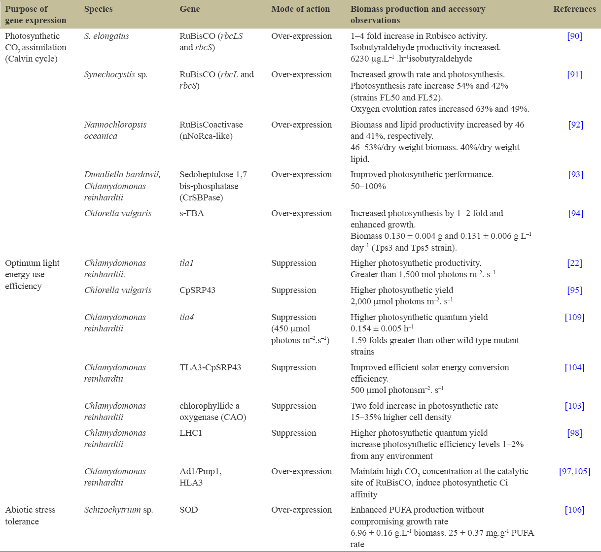 Table 2: Genetic and metabolic engineering toward algal biomass enhancement.