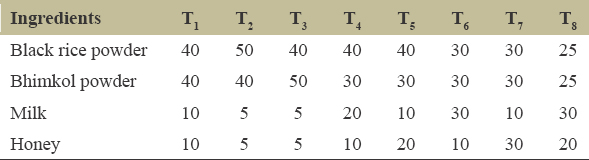 Eight different combinations of the product are taken and among them, T4 having black rice powder, bhimkol powder, milk, and honey in the ratio of 40:30:20:10 (all in %) showed the best product combination. In T1 and T5, although the product is formed and is similar to T4 after sensory analysis, it shows the best result thus has been accepted as the final product. In T2 and T3, the product did not form proper dough and it may be due to a high amount of solid ingredients (black rice and bhimkol powder) as compared to liquid components (milk and honey). In T6, T7, and T8, the dough becomes sticky, it may be due to the high amount of liquid component as compared to the solid ingredients.