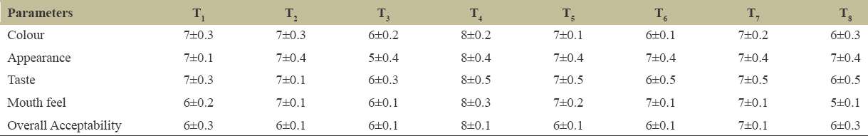 | Mouth feel | 6±0.2 | 7±0.1 | 6±0.1 | 8±0.3 | 7±0.2 | 7±0.1 | 7±0.1 | 5±0.1 |