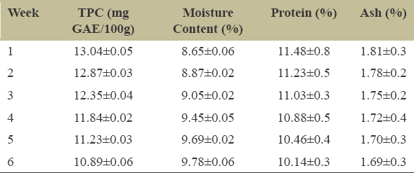 | Week | TPC (mg GAE/100g) | Moisture Content (%) | Protein (%) | Ash (%) |