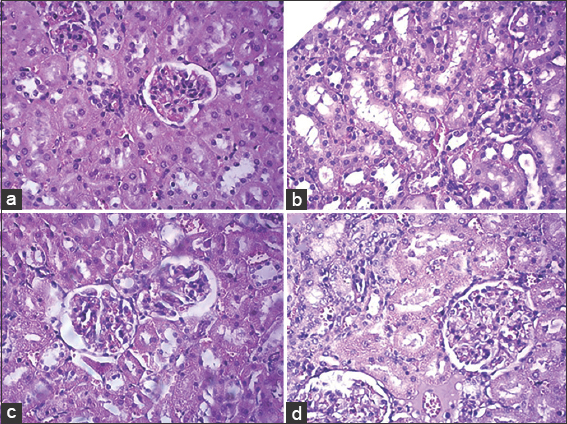 | Figure 4: Kidney histology (a) control (×400); (b) 200 mg/KgBW (×400); (c) 400 mg/KgBW (×400); and (d) 800 mg/KgBW (×400). [Click here to view] |