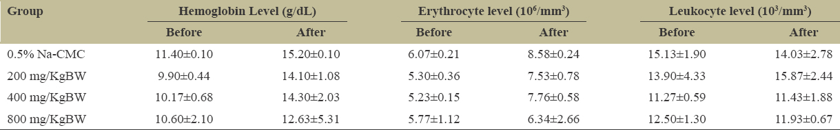 The group of rats had Hb levels below the normal range before the sample administration as shown in Table 1. The normal range of Hb levels in rats is 8–16 g/dL [13]. Hb levels can be influenced, among others, by age, sex, feed, environment, and physical activity. The low levels of Hb before treatment can be caused for environmental temperature factors and the physical activity of rats. Hb levels will increase at low ambient temperatures and will decrease at high ambient temperatures. Rat activity decreased during the day when compared to the night. After 28 days of the sample administration, there is an increase in Hb levels but they are still within normal limits.