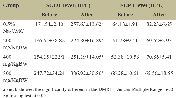 The one-Way ANOVA test showed a significant difference in the group after the administration of the sample. Based on the post hoc DMRT follow-up test, there was a significant difference (P < 0.05) between the 800 mg/KgBW test group and the control group, and the 200 mg/KgBW test group and also the 400 mg/KgBW test group. The groups with doses of 200 and 400 mg/KgBW showed no difference (P > 0.05) compared with the control group. The paired t-test of SGOT levels showed a significant difference (P < 0.05) in the control group, the 400 mg/KgBW group, and the 800 mg/KgBW group. The significant increase in the control and 400 mg/KgBW groups was still within the normal limits of SGOT levels in male rats. In comparison, the increase in SGOT in the 800 mg/KgBW group could be associated with SGPT levels and the results of liver histology examination.