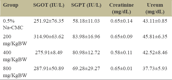Rat blood was collected by the retro-orbital plexus method from the eye veins. The blood is centrifuged to separate the plasma from the serum before the serum is used for biochemical tests. Determination of biochemical levels was carried out on SGOT, SGPT, creatinine, and urea parameters. The results are in following Tables 3-5.