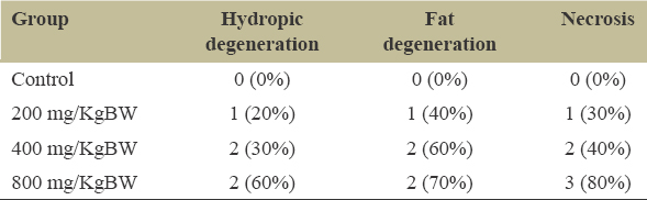 The damage of hepatocytes and sinusoids around the central vein is an indicator of liver function, while the damage of the proximal tubule is an indicator of kidney function. In the liver, the damage parameters are hydropic degeneration, fat degeneration, and necrosis. The degree of organ damage of as many as 100 proximal tubules in the kidney was calculated with the parameters observed: Tubular cell dilatation, necrosis, loss of brush border, protein cast, and cell vacuolization. Histopathological analysis was performed using a scoring technique. The liver and kidney damages are scored as follows: No lesion (0), mild lesions (1), moderate lesions (2), and severe lesions (3).
