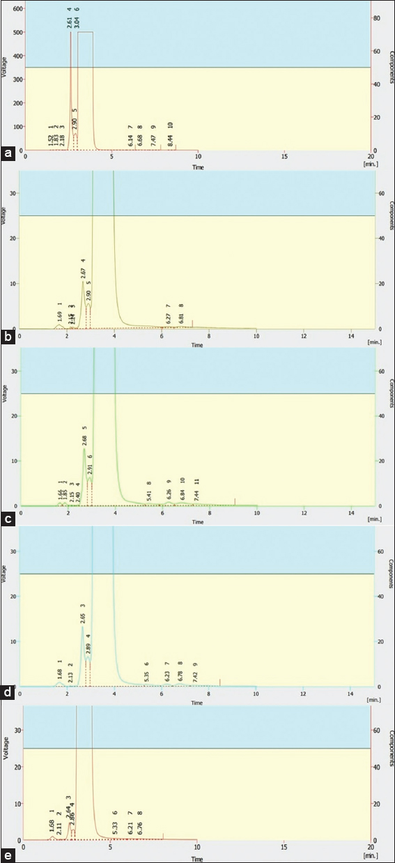 | Figure 1: Confirmation of monocrotophos (500 ppm) degradation. (a) High performance liquid chromatography chromatogram of standard undegraded monocrotophos. (b) Isolate MCPB1 treated monocrotophos in minimal salt medium (MSM). (c) Isolate MCPB2 treated monocrotophos in MSM. (d) Isolate MCPB3 treated monocrotophos in MSM. (e) Bacterial consortium treated monocrotophos in MSM. [Click here to view] |