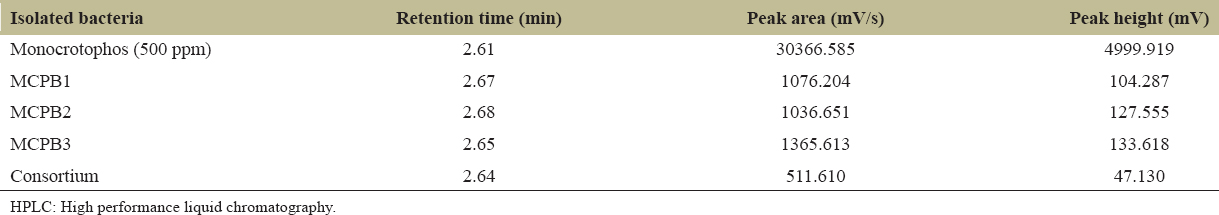 Table 1: Confirmation of monocrotophos degradation carried out by HPLC.