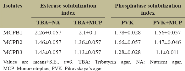 Values are means±S.E., n=3. TBA: Tributyrin agar, NA: Nutrient agar, MCP: Monocrotophos, PVK: Pikovskaya’s agar