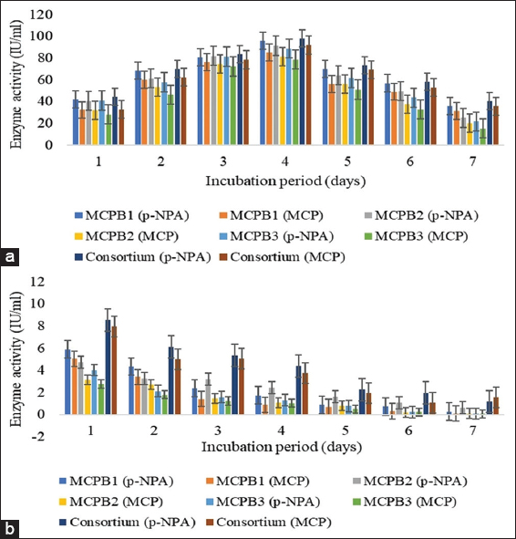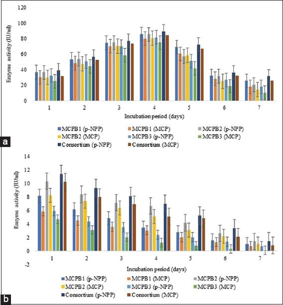 | Figure 3: Screening of phosphatase enzyme activity. (a) Extracellular phosphatase activity (IU/ml). (b) Intracellular phosphatase activity (IU/mL) (means ± S.E., n = 3). [Click here to view] |