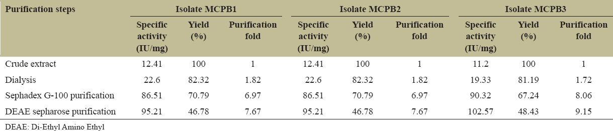 | Purification steps | Isolate MCPB1 | Isolate MCPB2 | Isolate MCPB3 | ||||||