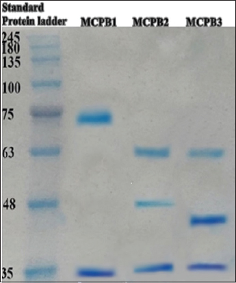 | Figure 4: Sodium dodecyl sulfate poly acrylamide gel electrophoresis analysis for determination of molecular weight (kDa) of enzymes (Phosphotriesterase) responsible for monocrotophos degradation, lane 1-standard molecular weight prestained protein ladder, lane 2-purified enzyme from isolate MCPB1, lane 3-purified enzyme from isolate MCPB2, Lane 4-purified enzyme from isolate MCPB3. [Click here to view] |