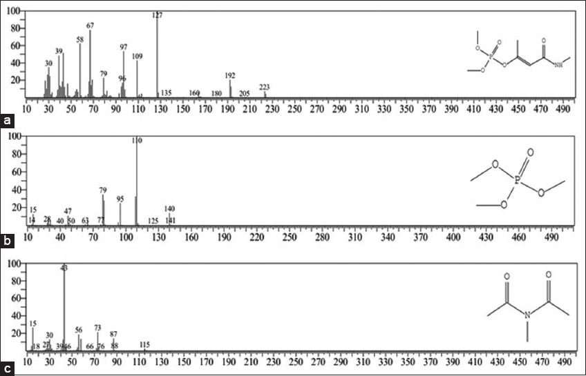 | Figure 5: Gas chromatography-mass spectrometry analysis of degraded metabolites produced by consortium treated monocrotophos (500 ppm). (a) Monocrotophos (m/z 223). (b) Trimethyl phosphate (m/z 140). (c) Acetamide N-acetyl N- methyl (m/z 115). [Click here to view] |