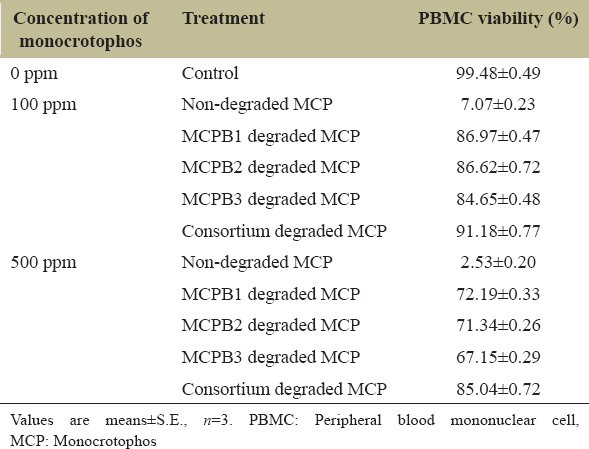 | Concentration of monocrotophos | Treatment | PBMC viability (%) |