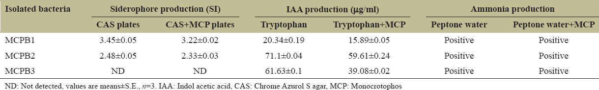 ND: Not detected, values are means±S.E., n=3. IAA: Indol acetic acid, CAS: Chrome Azurol S agar, MCP: Monocrotophos