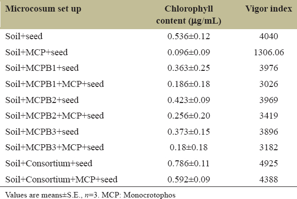 Table 7: Assessment of chlorophyll content and Vigor index for Microcosm experiment in the aspect of monocrotophos effect.
