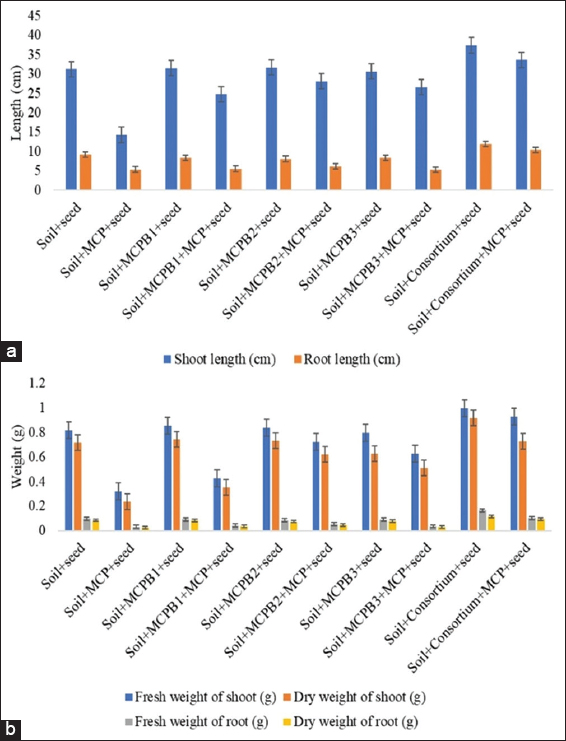 | Figure 6: Phytotoxicity assay carried out using microcosm approach. (a) Root and shoot length (cm) of Cicer arietinum with different combinations of experiment. (b) Fresh and dry weight (g) of root and shoot of C. arietinum (means ± S.E., n = 3). [Click here to view] |