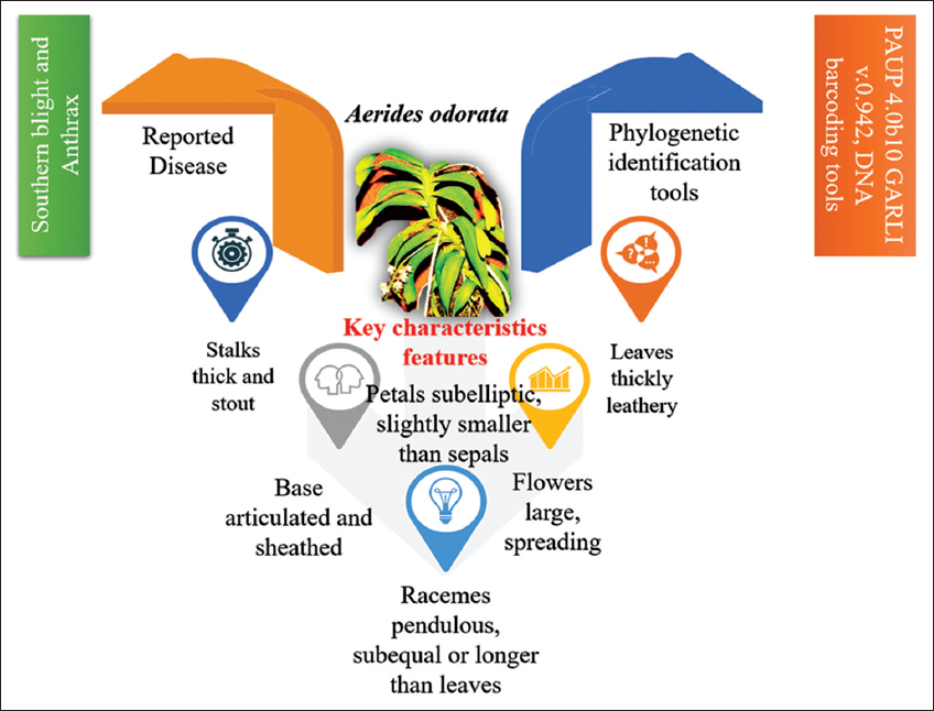 | Figure 1: General characteristics features, diseases, and phylogenetic tools of Aerides odorata. [Click here to view] |