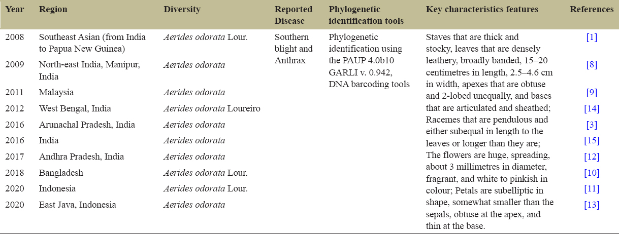 | 2008 | Southeast Asian (from India to Papua New Guinea) | Aerides odorata Lour. | Southern blight and Anthrax | Phylogenetic identification using the PAUP 4.0b10 GARLI v. 0.942, DNA barcoding tools | Staves that are thick and stocky, leaves that are densely leathery, broadly banded, 15–20 centimetres in length, 2.5–4.6 cm in width, apexes that are obtuse and 2-lobed unequally, and bases that are articulated and sheathed; Racemes that are pendulous and either subequal in length to the leaves or longer than they are; The flowers are huge, spreading, about 3 millimetres in diameter, fragrant, and white to pinkish in colour; Petals are subelliptic in shape, somewhat smaller than the sepals, obtuse at the apex, and thin at the base. | [1] |