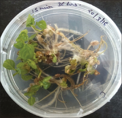| Figure 1: Agrobacterium rhizogenes-induced profuse production of highly branched hairy roots on nutrient media using aseptic tissue culture technique. [Click here to view] |