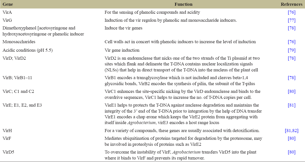 | VirE; E1, E2, and E3 | VieE1 helps to protects the T-DNA against nuclease degradation and maintains the integrity of the 3’ end of the T-DNA prior to integration by the help of DNA transfer VirE1 encodes a chap erone which keeps the VirE2 protein from aggregating with itself inside Agrobacterium, virE3 encodes a host range locus | [81] |