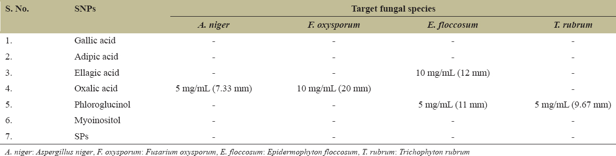 Evaluation of the antifungal activity of the SNPs was performed by well diffusion assay. About 150 μL of pre-cultured test organisms were spread onto the agar plates and wells of 6 mm in diameter were punched in specific agar media. Based on previously documented literature, various concentrations of SNPs such as 1, 2.5, 5, and 10 mg/mL were loaded into the wells [16]. Fungal plates were incubated at room temperature for 48–96 h, after which zones of inhibition were measured and tabulated.