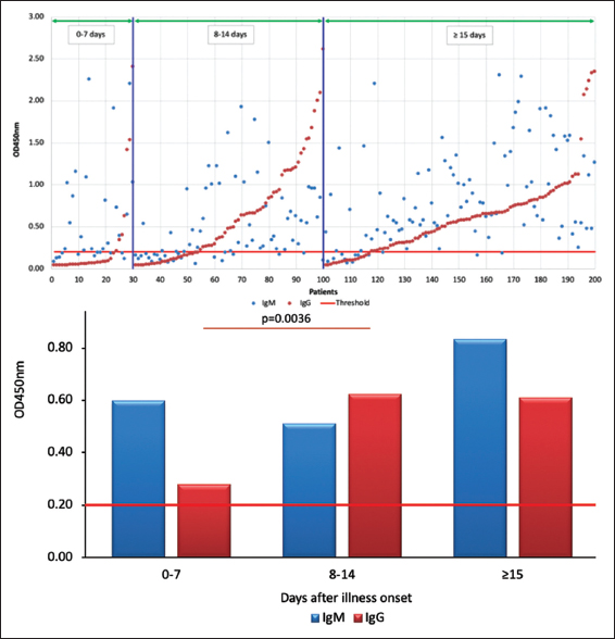 | Figure 2: The positive rates and levels of anti-protein N IgM and IgG antibodies in COVID-19 patients in periods after symptoms onset (0–7 days, 8–14 days, and more than 15 days). [Click here to view] |