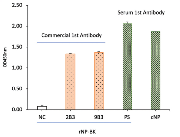 The full length sequence encoding SARS-CoV-2 nucleoprotein was optimized to be compatible with the E. coli host strain and maximize the efficiency of gene expression [Figure S1 and Figure S2]. The optimized sequence was presented in the supporting information. The recombinant SARS-CoV-2 nucleocapsid protein (rNP-BK) was expressed in E. coli BL21(DE3) and purified using the Ni-NTA kit. The result is shown in Figure S3. The activity of rNP-BK was checked by the ELISA method using commercial monoclonal antibodies against SARS-CoV-2 and positive serum from COVID-19 patients as the primary antibody. The result showed that rNP-BK reacted with both commercial monoclonal antibodies (clones 2B3 and 9B3 from MyBiosource). The rNP-BK also strongly reacted with antibodies in the serum of COVID-19 patients and is comparable to commercial NP [Figure 3]. These results indicated that the rNP-BK produced in this study was active and suitable for further application.