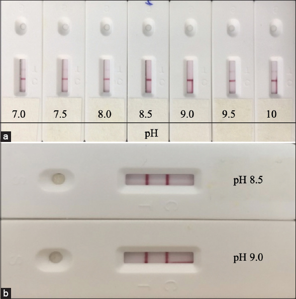 | Figure 4: The performance of LFA with conjugate preparation at various pH values was evaluated using a negative (a) and positive (b) sample. [Click here to view] |