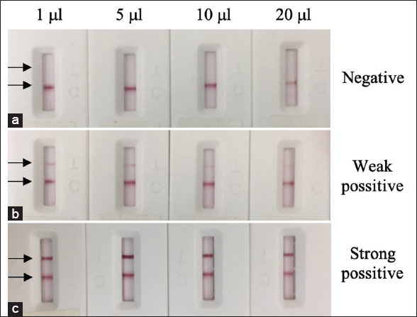 | Figure 8: Performance of the LFA test strip with different sample volumes of 1, 5, 10, and 20 µL. The assay was taken with negative (a), weak positive (b) and strong positive (c). [Click here to view] |