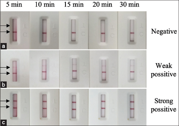 It is important to note that the sensitivity and specificity of the assay may change as time passes from the moment of sample loading. Therefore, read time is essential in determining the result of the test strip. While early reading may be subjected to high background and unsaturated signals, prolonged reading time may lead to false negative results. To determine the optimal read time, the generated FLA was tested with negative, weak positive, and strong positive samples and read at five different time points of 5, 10, 15, 20, and 30 min. The T-line can be seen clearly with the naked eye from as early as 5 min, while no false positives were observed for up to 30 min. However, after 10 min of loading, the result is still not conclusive due to the high background. At the 15-min mark, a clear background and the most significant intensity of the T line can be observed [Figure 9]. Thus, the optimal reading time was chosen to be 15 min.