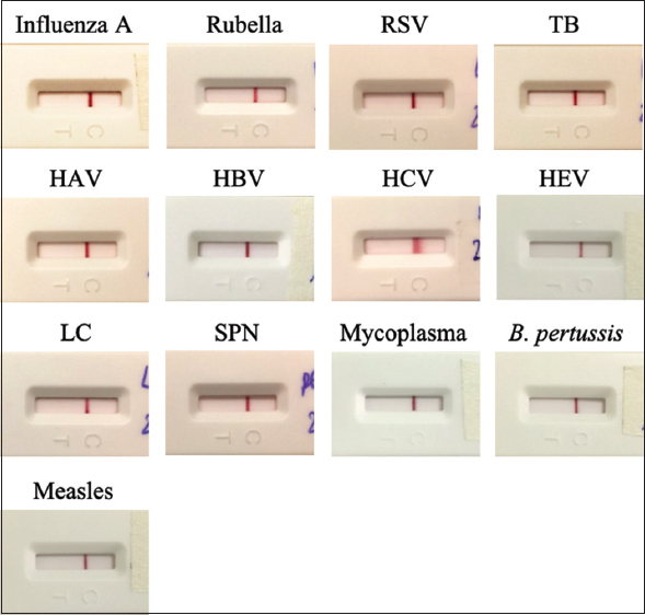 In practical application, samples containing high-titer antibodies to microorganisms of similar structure to SARS-CoV-2 could potentially result in false positives. Following the guidelines of WHO for in vitro diagnostics detecting antibodies to the SARS-CoV-2 virus, the cross-reactivity of the generated LFA strip was evaluated by testing serum/plasma containing antibodies against the following microorgansims: influenza A virus (5 samples), Rubella (four samples), Respiratory syncytial virus (three samples), Mycobacterium tuberculosis (three samples), Hepatovirus A (three samples), Hepatovirus B (19 samples), Hepatovirus C (13 samples), Hepatovirus E (one sample), Streptococcus pyogenes (three samples), Streptococcus pneumoniae – (two samples), Human Immunodeficiency virus (one sample), Dengue virus (three samples), Mycoplasma (one sample), Bordetella pertussis (one sample), and Measles virus (one sample). No tested strips showed visible T lines [Figure 12], which indicated the test’s satisfactory specificity.