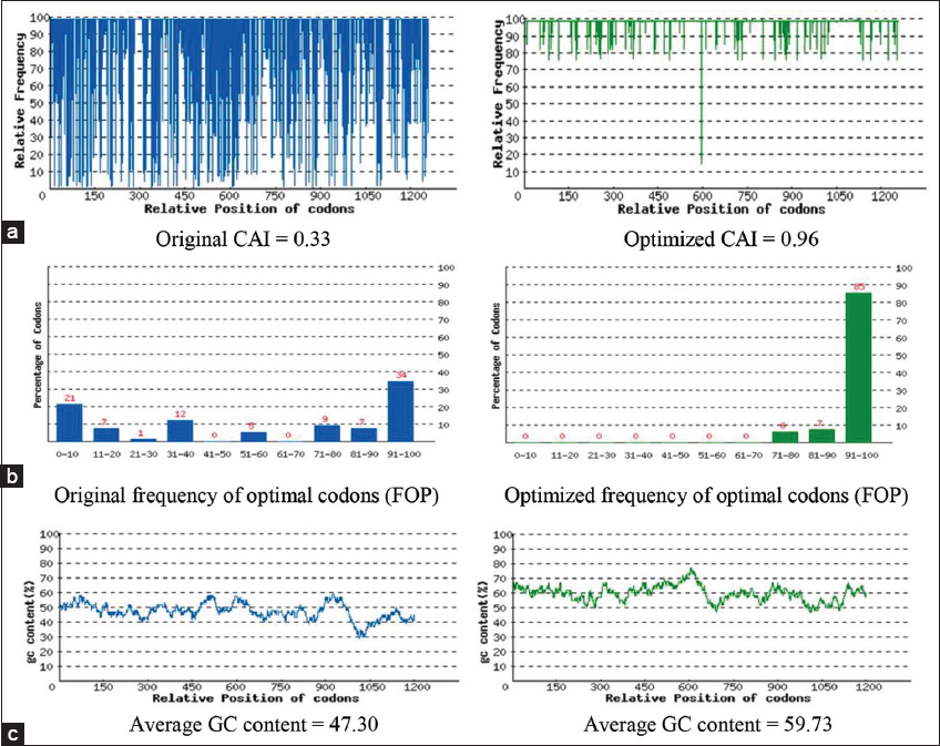 | Figure S1: (a) The distribution of codon usage frequency along the length of the gene sequence. A Codon Adaptation Index (CAI) of 1.0 is considered to be perfect in the desired expression organism, and a CAI > 0.8 is regarded as good, in terms of high expression level. (b) The percentage distribution of codons in computed codon quality group. The value of 100 is set for the codon with the highest usage frequency for a given amino acid in the desired expression organism. (c) The GC content adjustment. The ideal percentage range of GC content is between 30% and 70%. Peaks of %GC content in a 60 bp window have been removed. [Click here to view] |