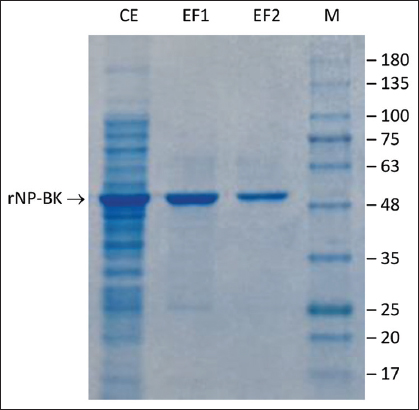 | Figure S3: SDS-PAGE of recombinant SARS-CoV-2 nucleoprotein (rNP-BK). CE, crude extract from recombinant Escherichia coli BL21 (DE3) after induction; EF1 and EF2, Eluted Fractions before and after imidazole removal; M, GangNam-STAIN Prestained Protein Ladder (iNtRON Biotechnology, Korea). [Click here to view] |