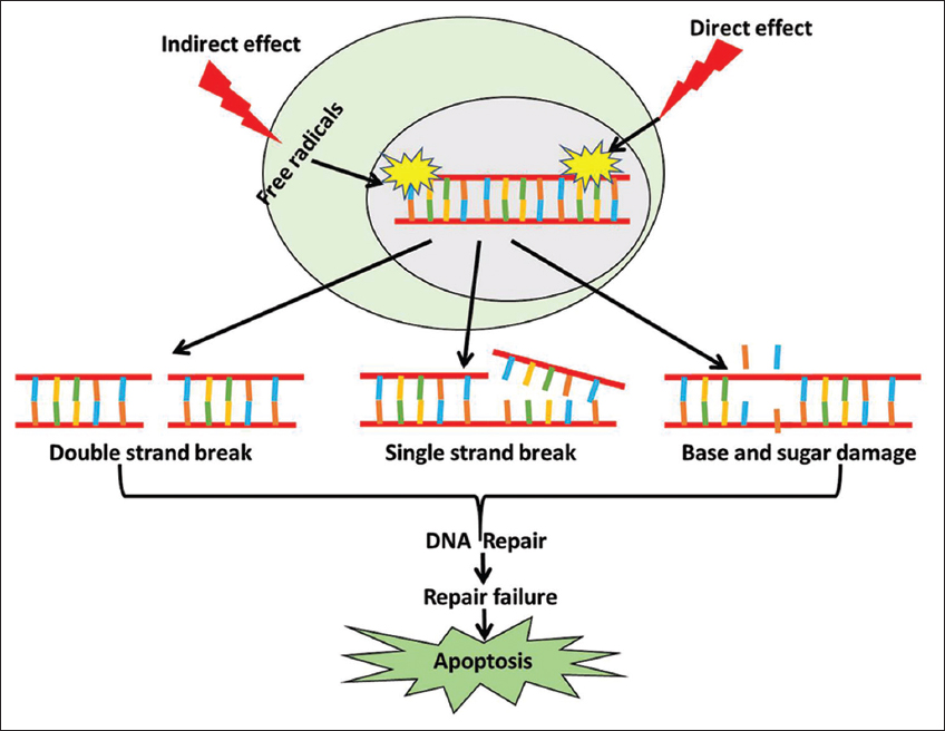 | Figure 1: Mechanism of ionizing radiation (IR) induced cell death. IR causes deoxyribonucleic acid (DNA) damage directly or indirectly through generation of reactive free radicals. Failure in DNA repair mechanisms induces cell death. [Click here to view] |