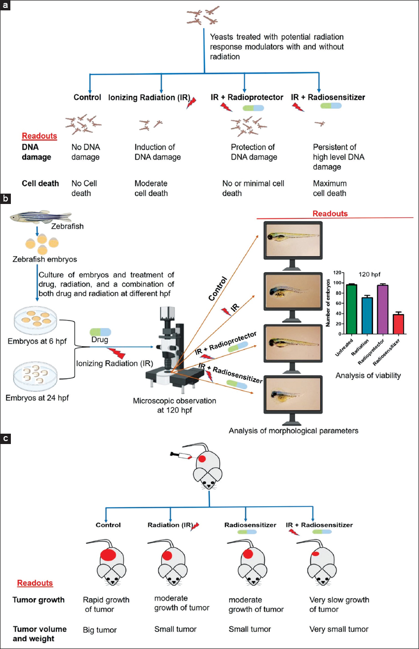 | Figure 4: Different in vivo models used for screening of radiosensitizer and radioprotectors. (a) Yeast cells exposed to radiation in presence of radioresponse modulators facilitates evaluating their effects through estimation of levels of cellular deoxyribonucleic acid damage and cell death, (b) the zebrafish embryos are useful to evaluate effects of radio-response modulators based on their effects on radiation-induced morphological changes and/or viability and (c) experimental tumor bearing mice helps to evaluate radiosensitizers based on their effects on overall tumor growth. [Click here to view] |