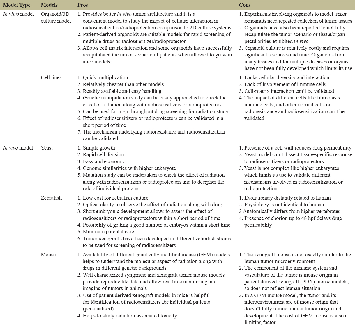 Table 1: Advantages and limitations of different models used for the screening of radiosensitizers and radioprotectors