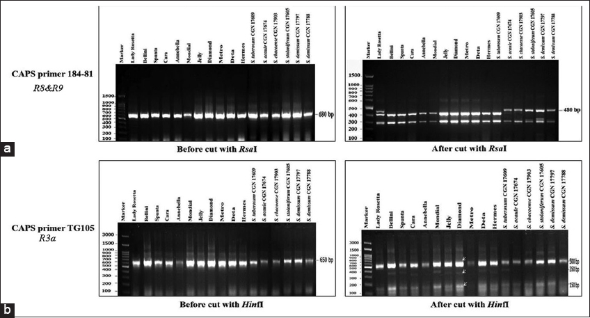 | Figure 4: Detection of resistance genes R8 and R9a combination and R3a using cleaved amplified polymorphic sequence (CAPS) primer 184-81 and CAPS primer TG105, respectively. (a) CAPS marker using primer pair 184-81 before and after cut with RsaI, (b) cleaved amplified polymorphic sequence marker using primer set TG105 before and after cut with HinfI. [Click here to view] |