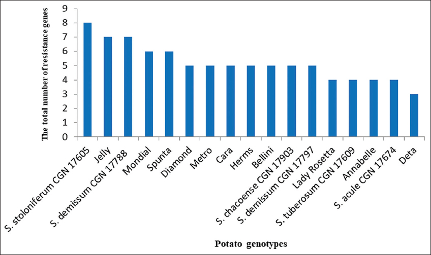 | Figure 5: Illustrate the total number of late blight resistance (R) gene markers in 17 potato genotypes. [Click here to view] |