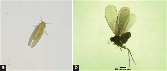 | Figure 2: Bemisia spp. observed using stereo zoom (a) and light microscope (4 × 10) (b) Bar= 200 µm. [Click here to view] |