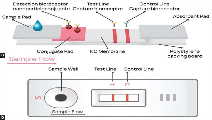 A swab is used to capture the specimen, and an extraction buffer is used to separate the SARS-CoV-2 antigen from the swab. After coming into touch with the test strip, the antigen extracts move across it by capillary action. If the extract contains SARS-CoV-2 antigen, it will bind to the antibody conjugates. The pre-coated anti-SARS-CoV-2 antibody then captures the immune complex on the membrane, resulting in the formation of a colorful T line and a positive COVID-19 test result. Internal control (C line) in the test should display a colored line regardless of color development on the T line [16]. The test is invalid and the specimen must be retested using a new device if the C line does not develop.