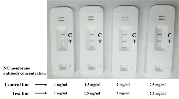 The ideal antibody concentration (10–70 ng/ml) with colloidal gold was evaluated to optimize the colloid gold test strip assay. The conjugate was stable and stably captured colloidal gold particles using a minimum of 20 ng/ml SARS-CoV-2 Recombinant Nucleocapsid Monoclonal Antibody [Figure 3] [19]. The best dilution for the concentration of colloidal gold was found to be 1:2. [Figure 4a and b]. At 2 mg/mL, the performance of both coating antibodies such as goat anti-mouse IgG and COVID-19 Nucleocapsid Recombinant Monoclonal Antibody was at its best [Figure 5]. A number of parameters and the reaction conditions was adjusted to increase sensitivity and accuracy [20].