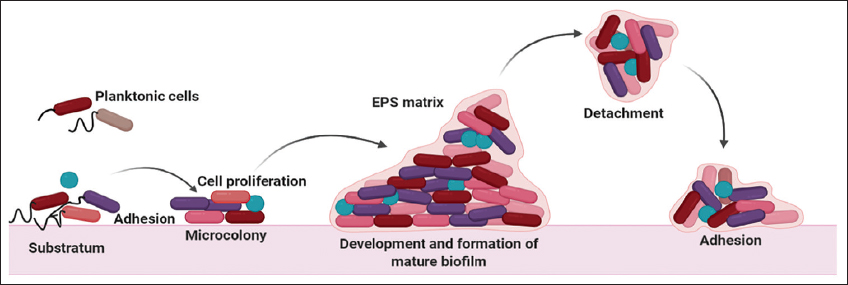 Acute infections, the inter-relationship between the pathogen and the host is two-way devastating since the virulent cytotoxic molecules produced by the bacteria damage the host cell response whereas the host immune system secretes reactive oxygen species (ROS), reactive nitrogen species, antimicrobial compounds, and increases phagocytic processes [17]. Motile P. aeruginosa is found to be more virulent and is easily detected by the host via the flagella or other motility apparatus. This induces inflammatory responses and triggers signaling pathways and enhances phagocytosis [10,13,18]. To survive, the bacterium opts for a sessile lifestyle with a low virulence capability so that it could avoid adverse stress conditions. They lose their motile function and adhere to surfaces to form microcolonies that are embedded in the extracellular polymeric substances to defend themselves from the fencing environment [Figure 2]. These biofilm structures are predominately mediated through complex cascading systems resembling the neural networks that confer endurance against ROS, phagocytosis, antimicrobial agents, and interspecies competitions [11,19,20]. Biofilms almost contribute to 90% of the total mass of the bacteria and these are formed on biotic and abiotic surfaces [Figure 2]. The matrix provides an intense niche to the biofilm with nutrients and energy supply for its survival during unfavorable conditions [21]. The matrix is composed of proteins, polysaccharides, lipids, and extracellular DNA as illustrated in Table 1 [22,23].