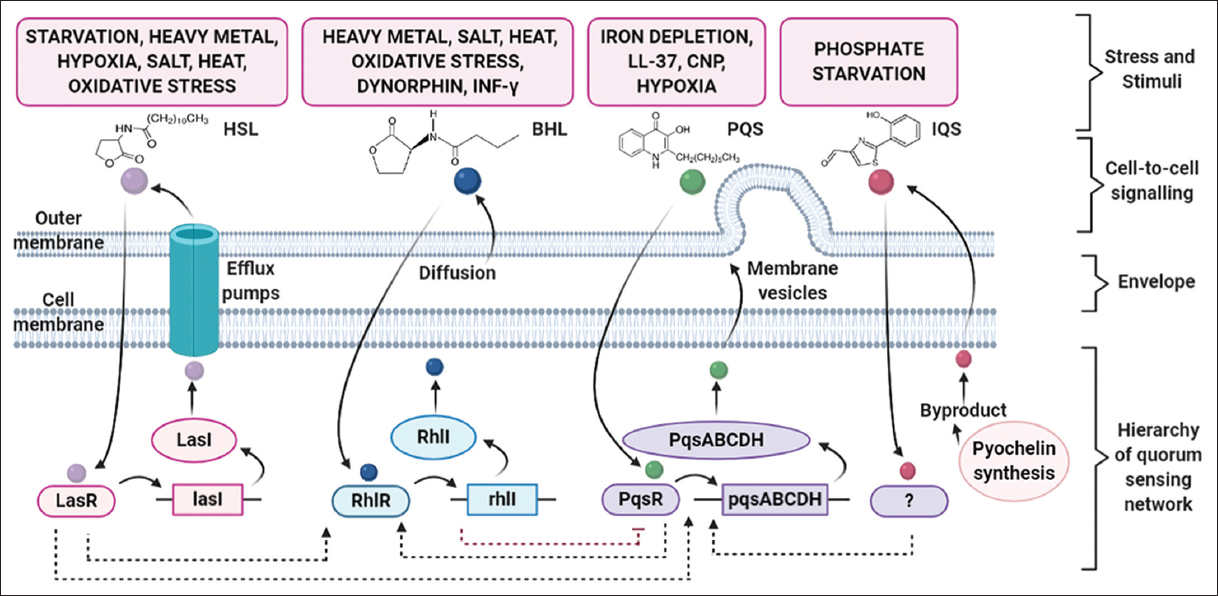 ![]() | Figure 3: Regulation of virulence factors and hierarchical quorum sensing network in Pseudomonas aeruginosa. [Click here to view] |