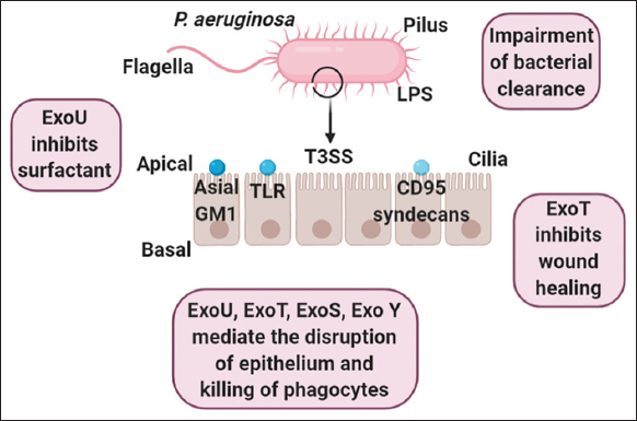 ![]() | Figure 1: Structure and pathogenic machinery of Pseudomonas aeruginosa. [Click here to view] |