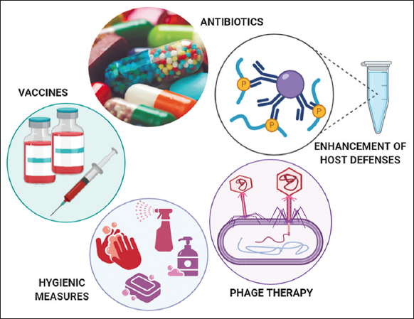 At present, available new approaches for the development of anti-pseudomonal therapies include antibiotics, vaccines, phage therapy, hygienic measures, and enhancement of host defense [Figure 6].
