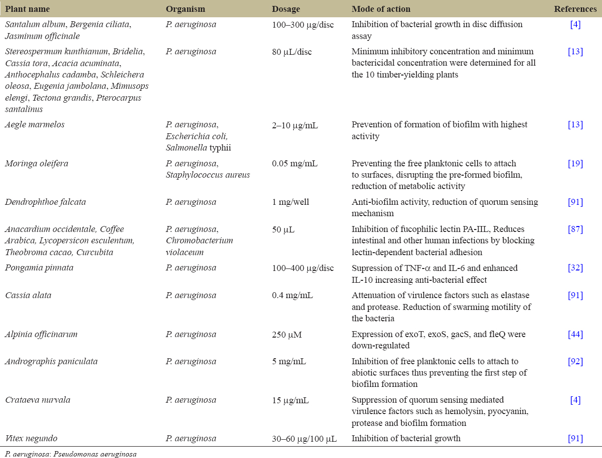 | Crataeva nurvala | P. aeruginosa | 15 µg/mL | Suppression of quorum sensing mediated virulence factors such as hemolysin, pyocyanin, protease and biofilm formation | [4] |