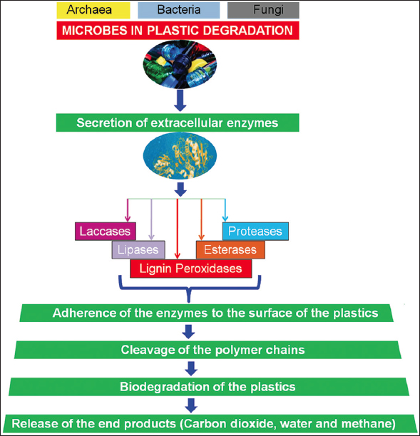 In light of the growing concern about the deleterious repercussions of these non-biodegradable plastics on environmental and human health, microorganisms should be considered extensively for remediation of plastic pollution in the environment. Recently, a handful of microorganisms were reported to eat certain plastics, breaking them down into their constituent molecules. These microorganisms can form biofilms on the periphery of pollutants resulting in a zone called plastisphere where they interact and engender acids or enzymes for the ruin of plastics. These miniature organisms represent a great vision to cope waste plastic materials with no uninvited impacts and could quickly play a key role in building a greener economy. Hence, this review article has been prepared to put in the picture the role of microbes in the biodegradation of plastic waste.
