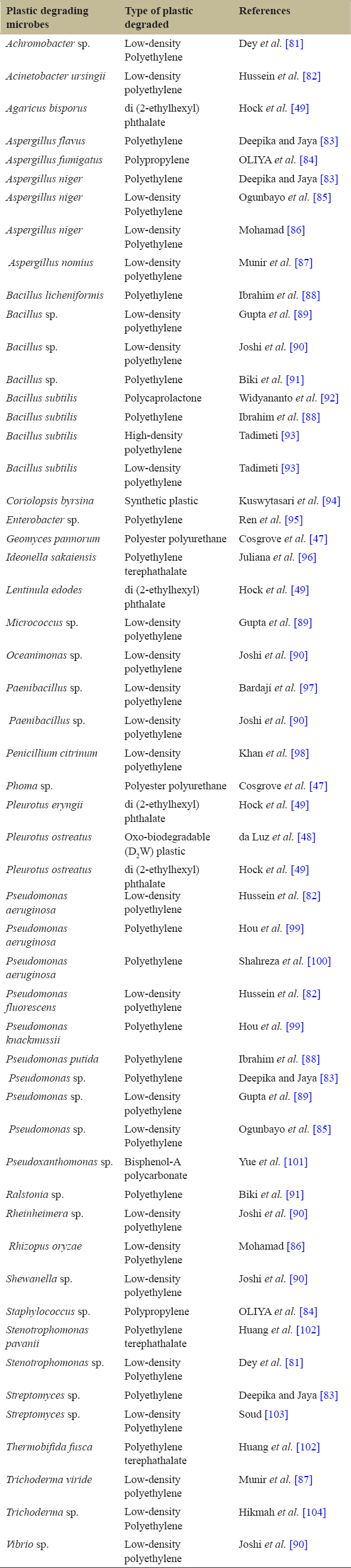 | Plastic degrading microbes | Type of plastic degraded | References |