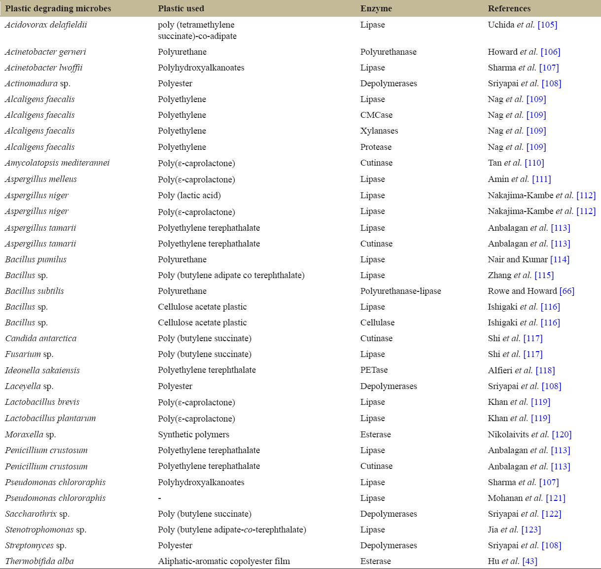 58. Bhardwaj H, Gupta R, Tiwari A. Communities of microbial enzymes associated with biodegradation of plastics. J Pol Environ 2013;21:575-9. [CrossRef]