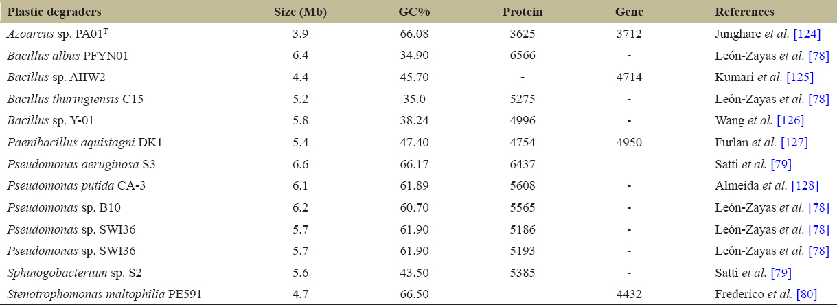 Bacteria are emerging as an excellent agent for degradation of the plastics. Studies have reported that bacteria with capability to degrade plastics such as Moritella sp., Pseudomonas sp., Psychrobacter sp., and Shewanella sp. have been reported to degrade PCL [36]. Vibrio alginolyticus and Vibrio parahemolyticus have been reported for PVA-LLDPE degradation [37]. Singh et al. [38] reported Bacillus sp., Pseudomonas sp., and Staphylococcus sp. for polythene degradation. Bacillus sp., Klebsiella sp., and Pseudomonas sp. have been reported to degrade polyethylene synthetic plastic. Clonostachys rosea, Pseudomonas sp., Rhodococcus sp., and Trichoderma sp. from the arctic soil have been reported for degradation of PCL and commercial available bag based on potato and corn starch [39].